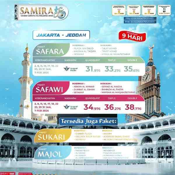 Wujudkan impian beribadah ke Tanah Suci dengan nyaman dan penuh khidmat. Samira Travel, sahabat Umroh & Haji keluarga Anda, hadir dengan pilihan paket perjalanan terbaik untuk keberangkatan Januari hingga awal Februari 2026.